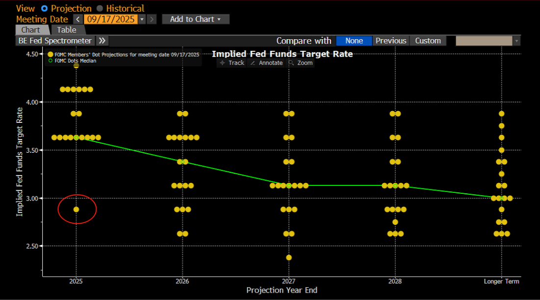 Much of the attention has been captured by the headline “Dot Plot,” which points to two more cuts this year. Yet looking beneath the surface tells a different story. Of the 19 voters, nine expect one cut or less, nine see two cuts, and the only extreme outlier is Miran, who was the previous Chairman of the Council of Economic Advisers under Trump, who just secured a seat on 16 September, who penciled in a staggering 125 basis points of easing in this FOMC. Without this outlier, the distribution sits squarely between one and two, leaving the true message far less dovish than the headline suggests.