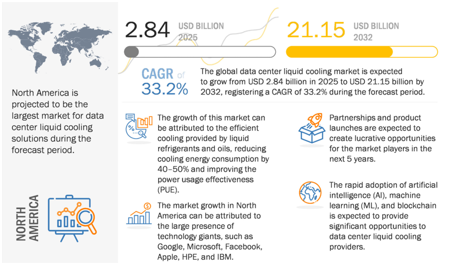 Despite the headlines, liquid cooling is still early in its adoption curve — which is exactly why investors are paying attention. According to Markets and Markets, the global data center liquid cooling market is projected to grow from USD 2.8 billion in 2025 to USD 21.1 billion by 2032, representing an eye-popping CAGR of over 33%.
