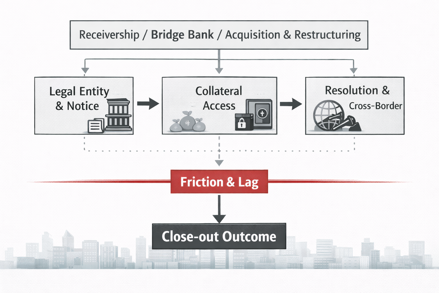 The first two episodes show how stress can run from market prices into margin calls. In 2023, the market confronted a different fear: even if you have the contractual right to terminate, you may not be able to turn that right into an immediate result. Close-out is not a button you press. It’s a path—and in real crises, that path can be interrupted by resolution regimes, custody structures, cross-border frictions, and operational constraints.