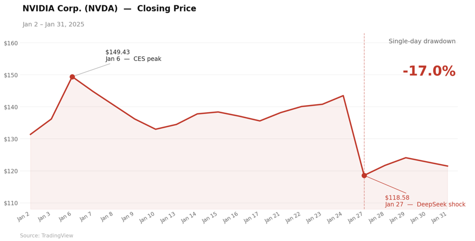 DeepSeek's emergence shattered the consensus. If a Chinese lab could match U.S. AI capability at a fraction of the cost, the entire investment thesis underpinning hundreds of billions in positions was suddenly in question. Funds that had been gradually reducing AI exposure over the prior months avoided most of the damage. Those still fully invested had no good options.