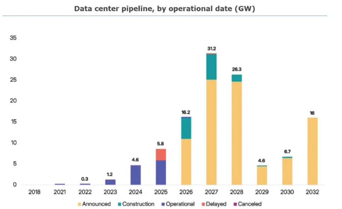 • 2027: ~31 GW announced, but only ~6.3 GW currently breaking ground