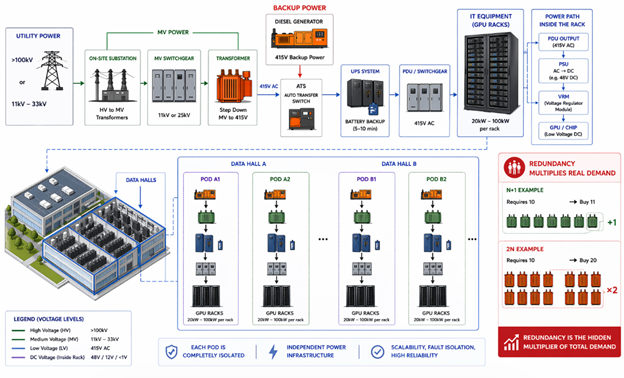 One more concept worth internalizing: redundancy multiplies real demand. Hyperscale facilities are typically built to N+1 or 2N redundancy standards — meaning if operations require 10 transformers, a 2N design requires purchasing 20. This is why transformer shortages hit data center construction harder than the headline supply figures suggest: every gigawatt of planned capacity requires significantly more than one gigawatt's worth of equipment.