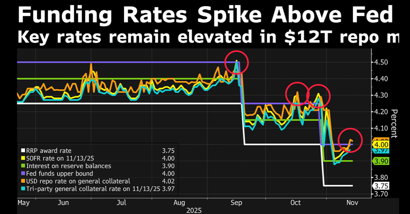 正因如此,我們在「資金壓力成為市場頭條」之前,就已密切關注回購市場。整個第三季,資金面在季底、稅期、資產負債表窗口期等熟悉節點反覆趨緊。這正是政策制定者最為警惕的狀況——因為看似微小的「管道摩擦」,往往正是系統性風險的起點。一旦準備金逼近舒適門檻,回購利率跳升、交易商中介能力收縮、季節性壓力就可能被迅速放大,重演 2019 年的情境。