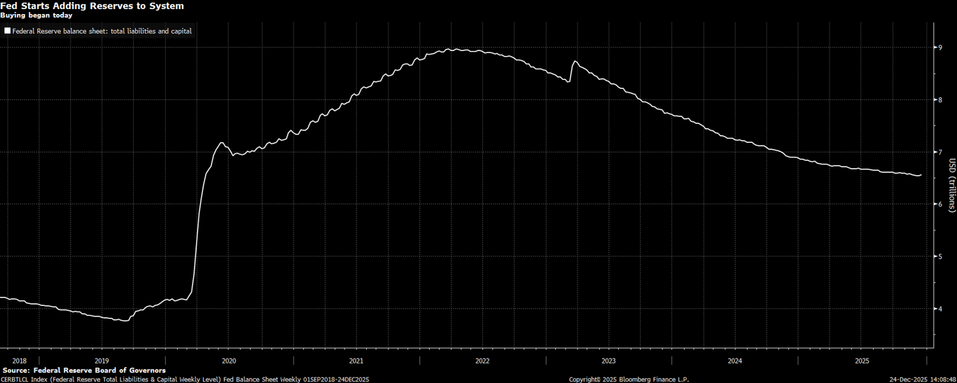 當市場仍聚焦於「還會再降息幾次」時,我們認為,更關鍵的機制轉變其實正在悄然發生。12 月 12 日,聯準會執行層啟動了準備金管理型購債(RMP)——每月約購買 400 億美元的短期國庫券,目的在於重建並維持準備金緩衝,降低資金面壓力突然升高的機率。同時,另一項仍被市場低估的重要措施也將在明年到來:**強化版補充槓桿比率(eSLR)**的再校準,將於 2026 年 4 月 1 日正式生效,並允許自 1 月 1 日起提前採用。兩者疊加,將顯著提升大型銀行在國債與附買回市場中的中介能力。