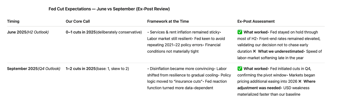 回顧過去一年我們對聯準會的判斷,方向大致正確,但在時點與幅度上需要修正。我們成功預判前 9 個月不會降息——服務業通膨與經濟韌性使聯準會得以按兵不動;但我們過早、且最終錯誤地排除了年底連續三次降息的可能性。