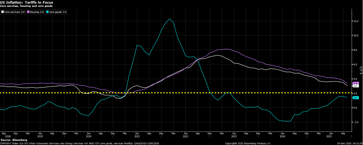 目前的總體環境已從「過熱」轉為景氣循環後段的減速。10–11 月政府關門與中美摩擦後,成長動能明顯走弱,且已反映在硬數據與修正值中,而非僅止於調查指標。相較之下,通膨表現明顯優於市場原先預期:CPI 年增率約 2.7%,前瞻動能幾近停滯。我們預期,在高庫存與供給端調整持續吸收關稅影響的背景下,未來數月通膨仍具下行壓力。