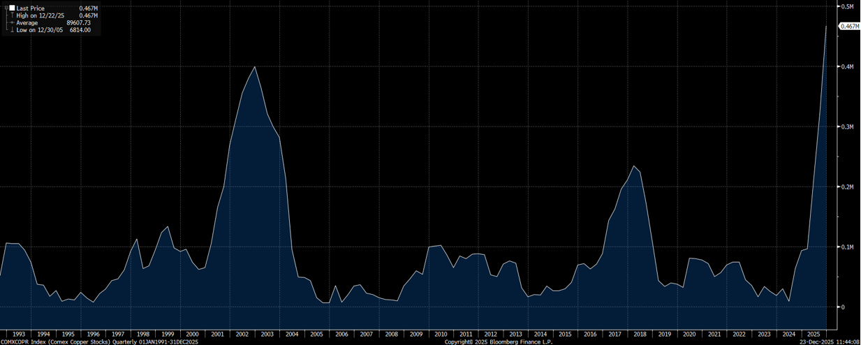 聯準會相較其他主要央行更有理由降息,其中一個關鍵在於庫存循環。美國國內關鍵物資庫存水位異常偏高,為通膨提供了緩衝。銅就是一個非常明顯的例子:目前庫存已達到除危機期間外罕見的高點,主因在於企業與高資產投資人在關稅實施前提前囤貨。