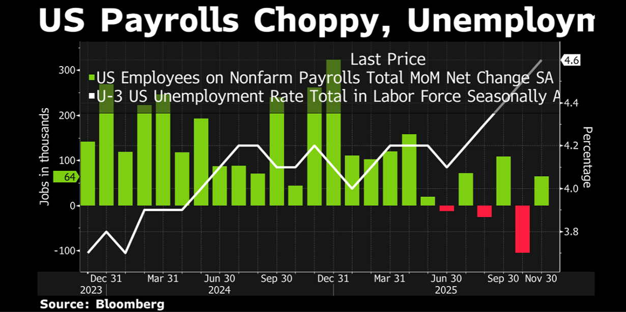 勞動市場的下行風險仍未被市場充分反映。就業成長已明顯放緩,10 月數據受到政府關門干擾而偏弱,11 月仍顯疲態;更重要的是,失業率已上升至 4.6%,無論是 3 個月或 6 個月平均新增就業人數,都指向動能下降。
