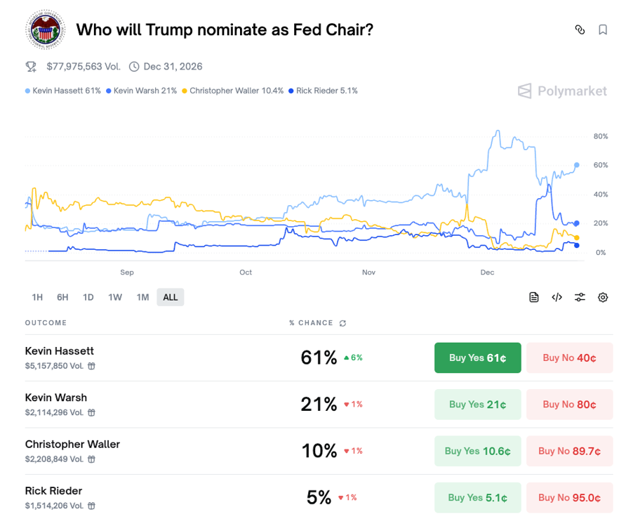 最後,聯準會領導層的變動確實提高了市場波動性,但並未改變政策路徑的中值判斷。鮑威爾的主席任期將於 2026 年 5 月 15 日結束,而其理事任期仍持續至 2028 年 1 月 31 日。財政部長史考特・貝森特已公開討論潛在繼任者,明確點名凱文・沃許(Kevin Warsh)與凱文・哈塞特(Kevin Hassett),且已有跡象顯示川普總統傾向其中一人。