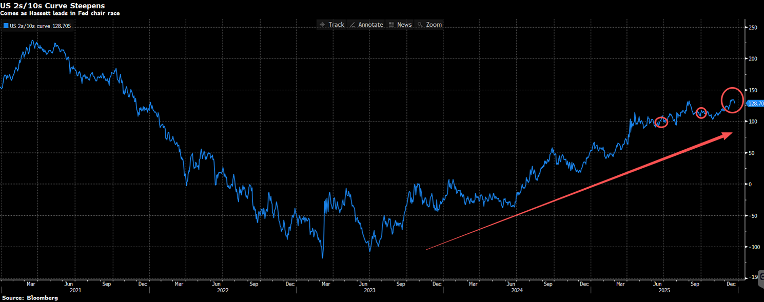 我們特別想強調:我們在 6 月的下半年展望與 9 月的第四季更新中所提出的核心框架,整體經受住了數據檢驗。6 月我們明確指出,正確的利率交易不是追逐純久期,而是透過殖利率曲線結構來表達機制轉變——偏好 2s10s 與 2s30s 的曲線陡峭化交易。此後,美國 2s10s 再度陡峭約 25 個基點,驗證了「曲線形態」相較「久期 Beta」更具交易價值。