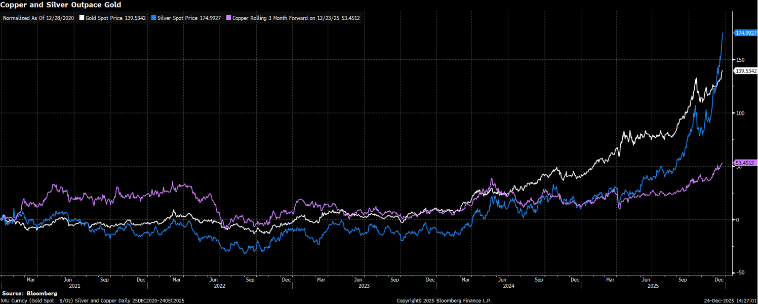 但我們同時認為,聯準會人事更替仍可能成為關鍵觸發點。若最終由哈塞特出任主席,市場很可能會以更快、也更劇烈的方式,將「偏鴿派+成長優先」的政策傾向反映在定價中。在此情境下,我們在 2026 年上半年最偏好的宏觀表達,仍是法幣貶值交易——黃金與其他貴金屬將持續扮演核心角色。