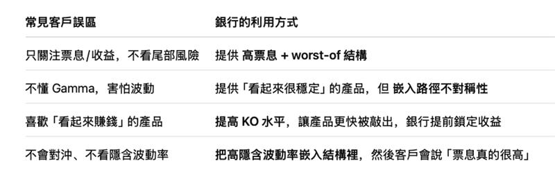 「一般投資人看到的是『折價買進』。 專業人士看到的是:波動率曝險、伽瑪(Gamma)曲線、路徑依賴, 以及投行如何刻意設計結構。」