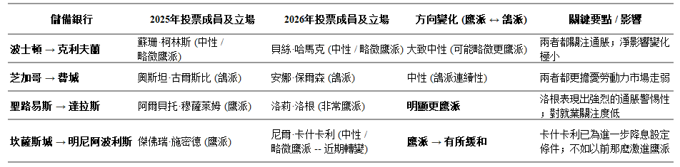 2026年輪值的地區聯儲投票席位來自:克利夫蘭、費城、達拉斯和明尼阿波利斯。